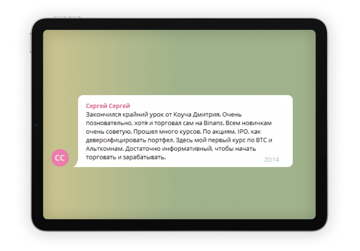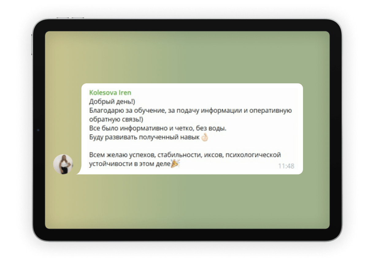 "Добрый день) Благодарю за обучение, за подачу информации и оперативную обратную связь!) Все было информативно и четко, без воды. Буду развивать полученный навык Всем желаю успехов, стабильности, иксов, психологической устойчивости в этом деле