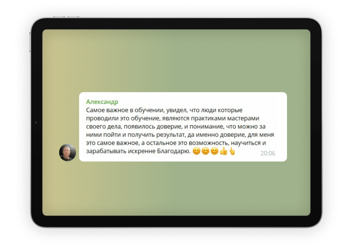 Самое важное в обучении, увидел, что люди которые проводили это обучение, являются практиками мастерами своего дела, появилось доверие, и понимание, что можно за ними пойти и получить результат, да именно доверие, для меня это самое важное, а остальное это возможность, научиться и зарабатывать искренне Благодарю.